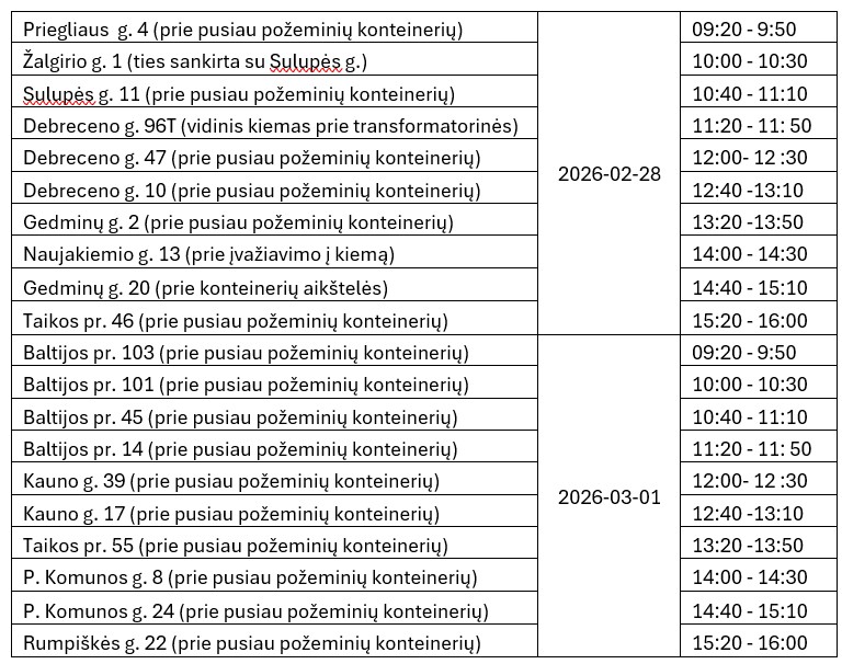 Vasario 28 dieną atliekų vežėjai lankysis Taikos prospekto, Priegliaus, Žalgirio, Sulupės, Debreceno, Gedminų, Naujakiemio gatvėse. O kovo 1 dieną – Baltijos ir Taikos prospektų, Kauno, Paryžiaus Komunos ir Rumpiškių gatvių kvartaluose.